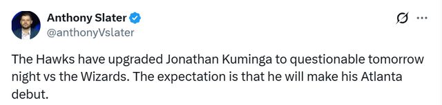 北京時(shí)間2月24日,據(jù)名記Slater報(bào)道,老鷹已將喬納森-庫(kù)明加明日對(duì)陣奇才的狀態(tài)升級(jí)為出戰(zhàn)成疑,預(yù)計(jì)他將在明日完成老鷹生涯首秀。