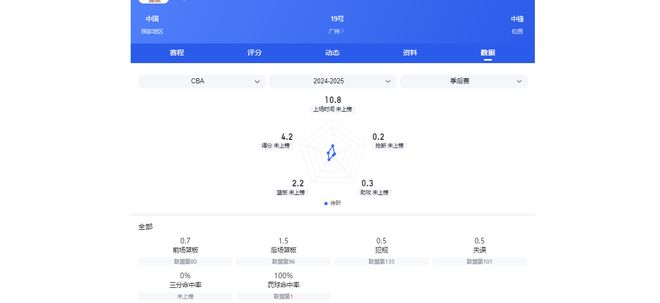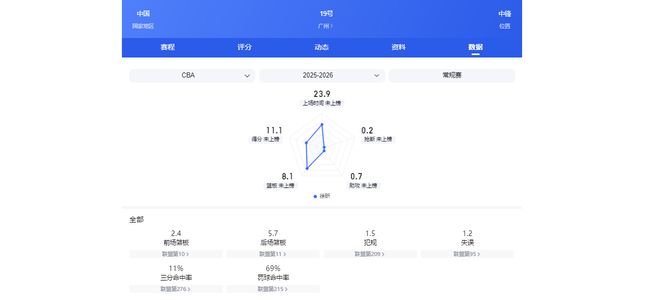 來到廣州男籃后,截至徐昕30次出場,他可首發(fā)29次,場均能獲24分鐘的出場時間,期間可為球隊場均貢獻11.1分8.1籃板1.9蓋帽0.7助攻,投籃命中率可保持在75.6%。