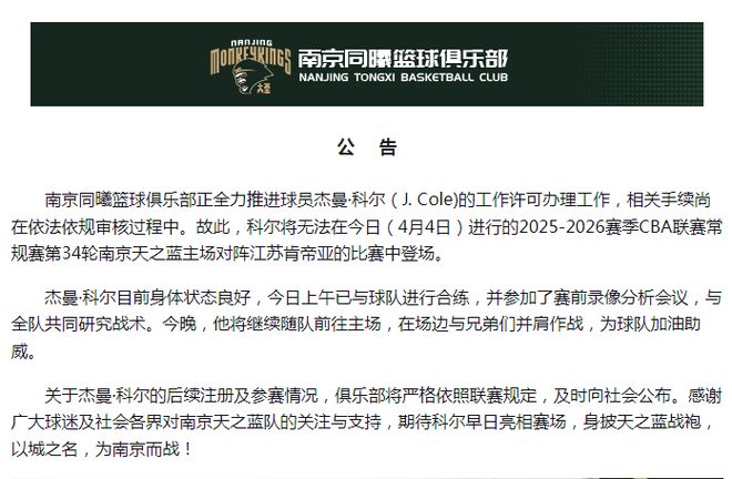 北京時(shí)間4月4日,南京同曦男籃官方發(fā)布公告,宣布新外援、說(shuō)唱歌手杰曼-科爾(J. Cole)的相關(guān)手續(xù)還在審核過(guò)程中,無(wú)法出戰(zhàn)今晚對(duì)陣江蘇男籃的德比對(duì)決。