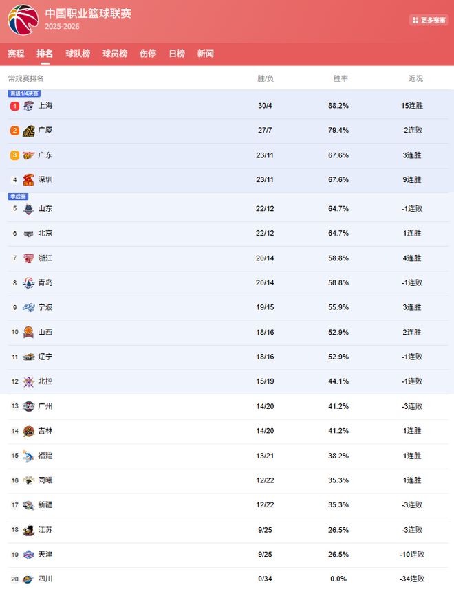 CBA最新排名: